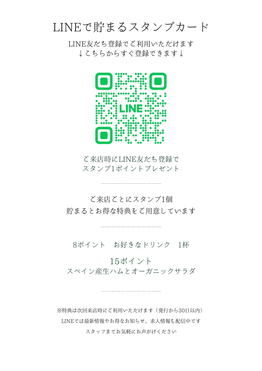 ご来店時にLINE友だち登録で、スタンプを1ポイントお付けしております。